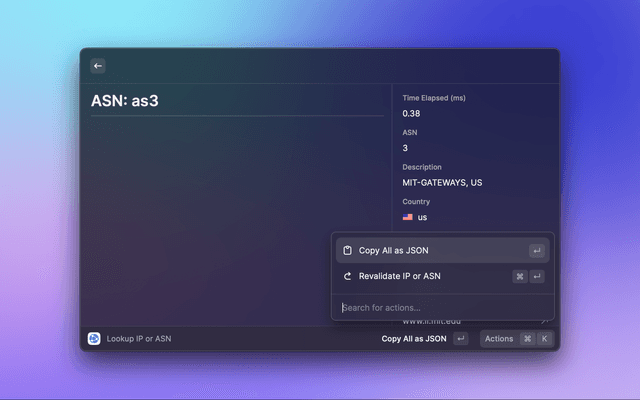 This is a Raycast extension for ipapi.is. With this extension you can Lookup IP or ASN via the ipapi.is API.