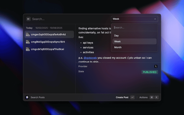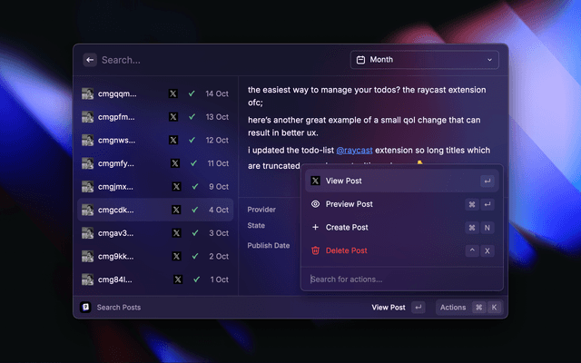 This is a Raycast extension for Postiz - The All-in-One Social Media Management Tool. With this extension you can: