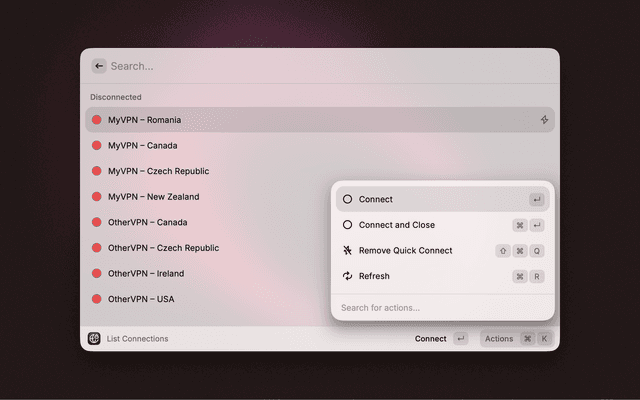 Manage your Viscosity VPN connections directly from Raycast: list, connect, and disconnect with ease.